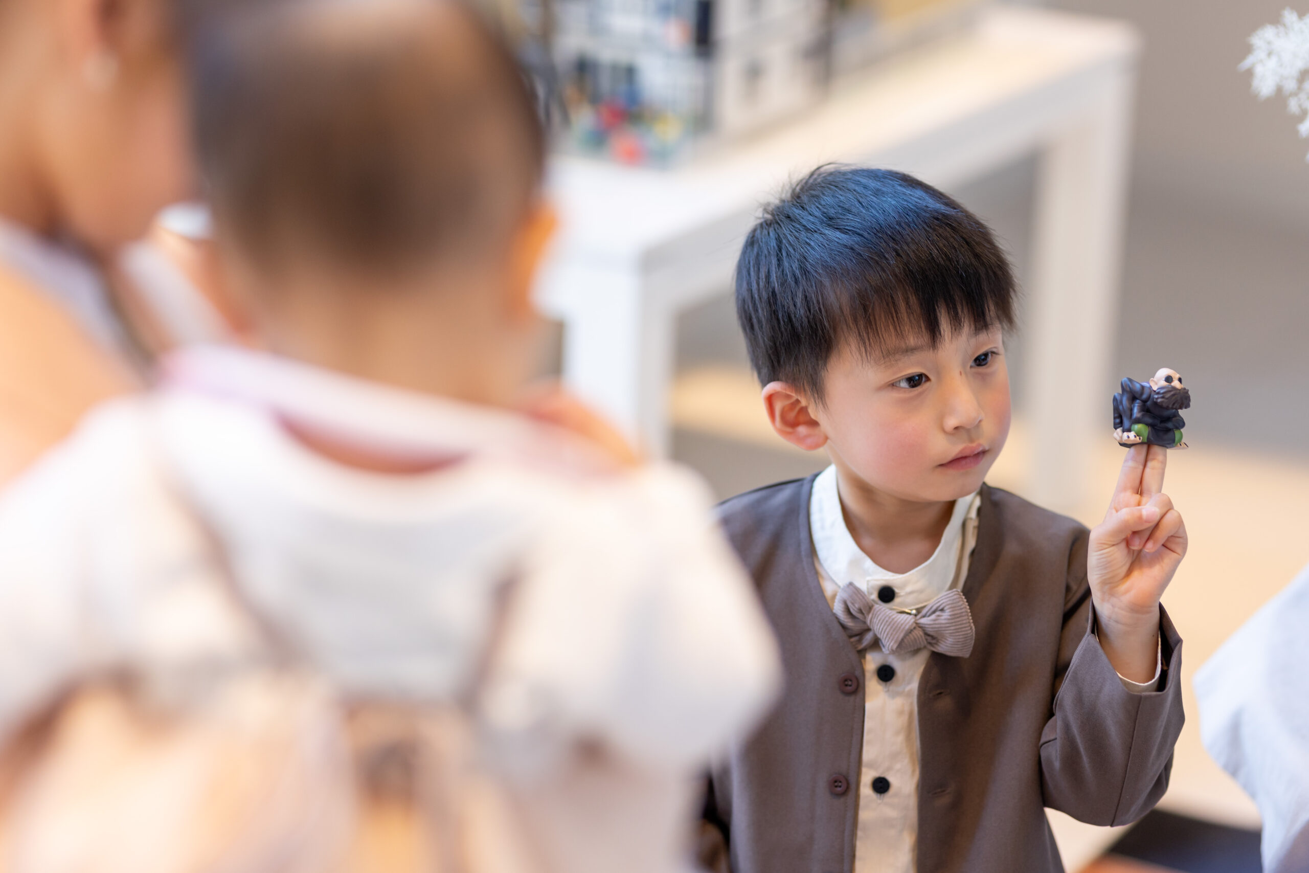 というご希望をもとに考え抜いた結果、大人には懐かしみを感じていただけて、お子様には遊びグッズにもなる指人形でゲストをお席までエスコート