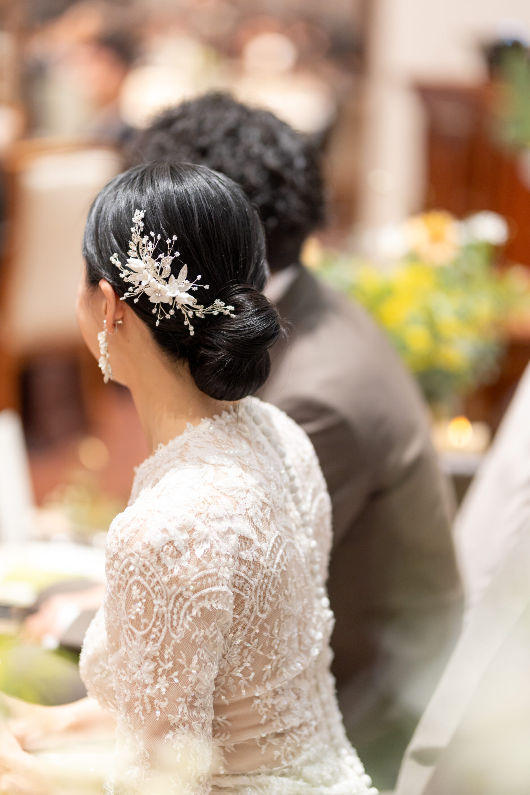 披露宴入場前にはヘッドパーツをつけてイメージチェンジ