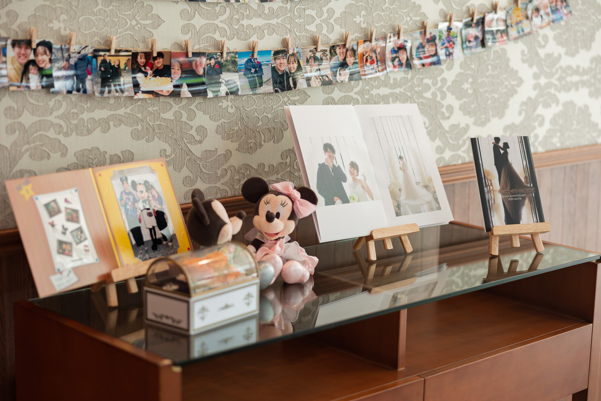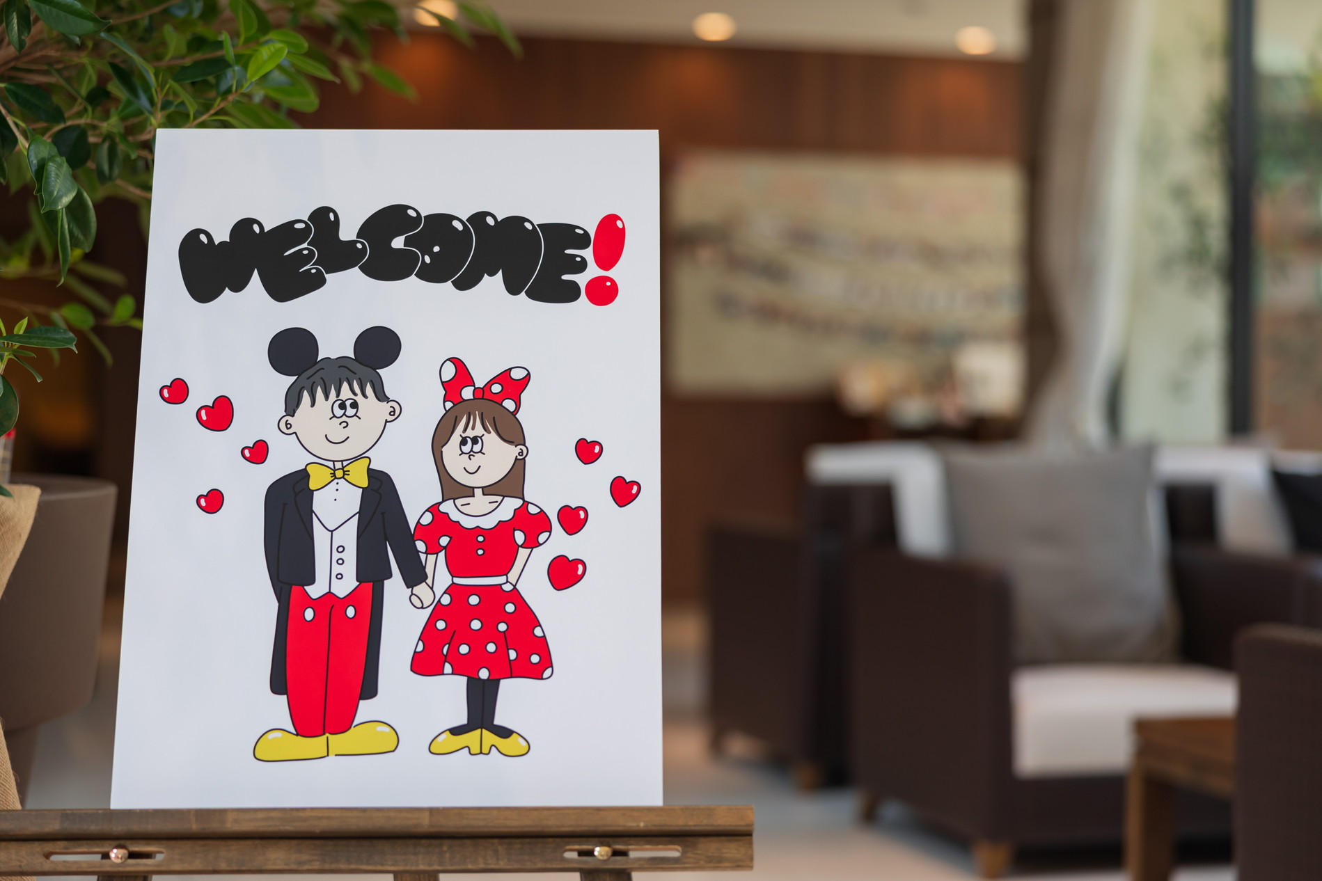 ウェルカムスペースは、大好きなディズニーのウェルカムボードやディズニーグッズを沢山飾り、おふたりらしい空間に仕上げました
