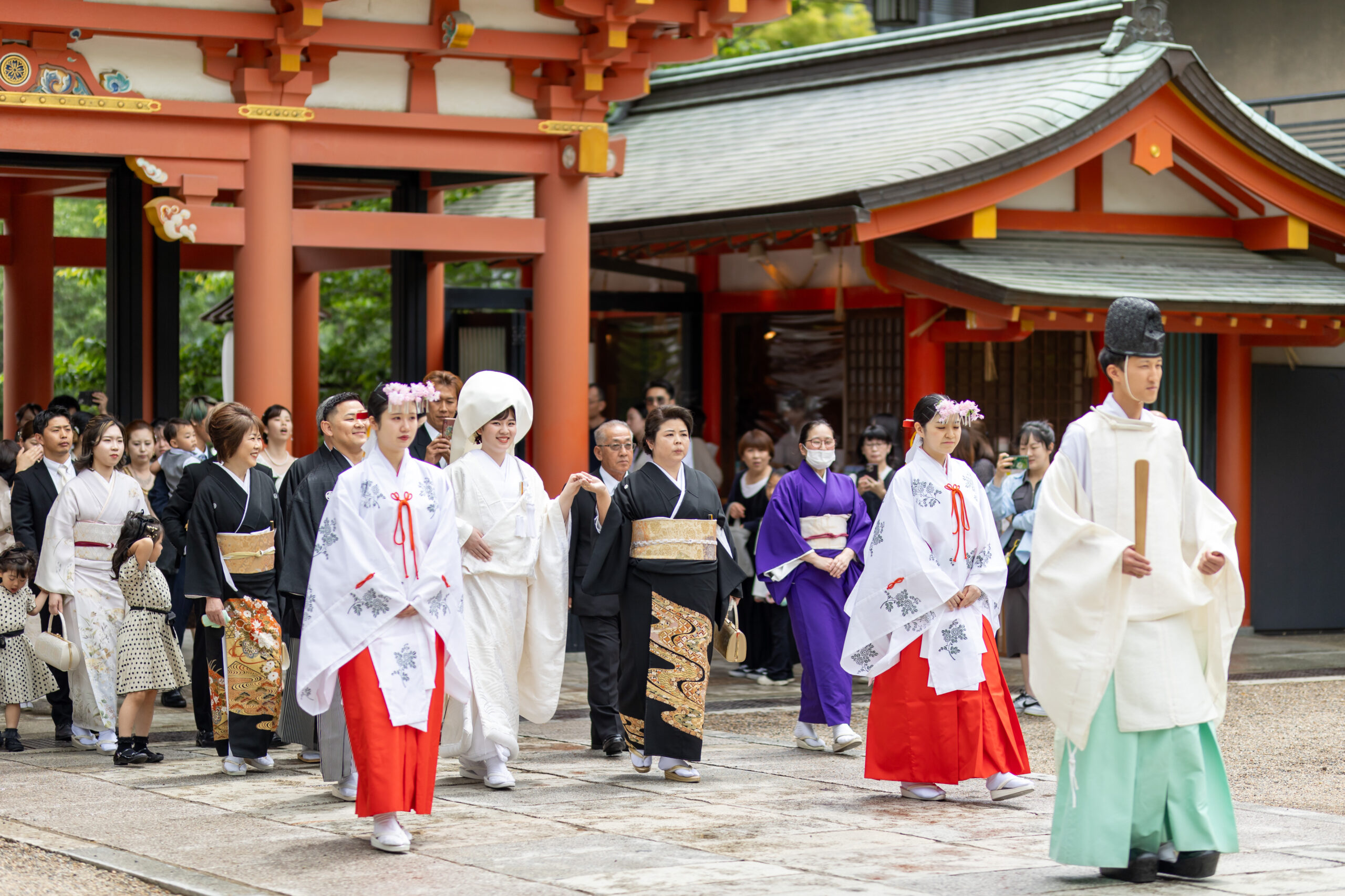 直前までの雨予報から一転、参進の儀とともに晴れ間が差し込み、まるでおふたりを祝福するかのようなお天気
