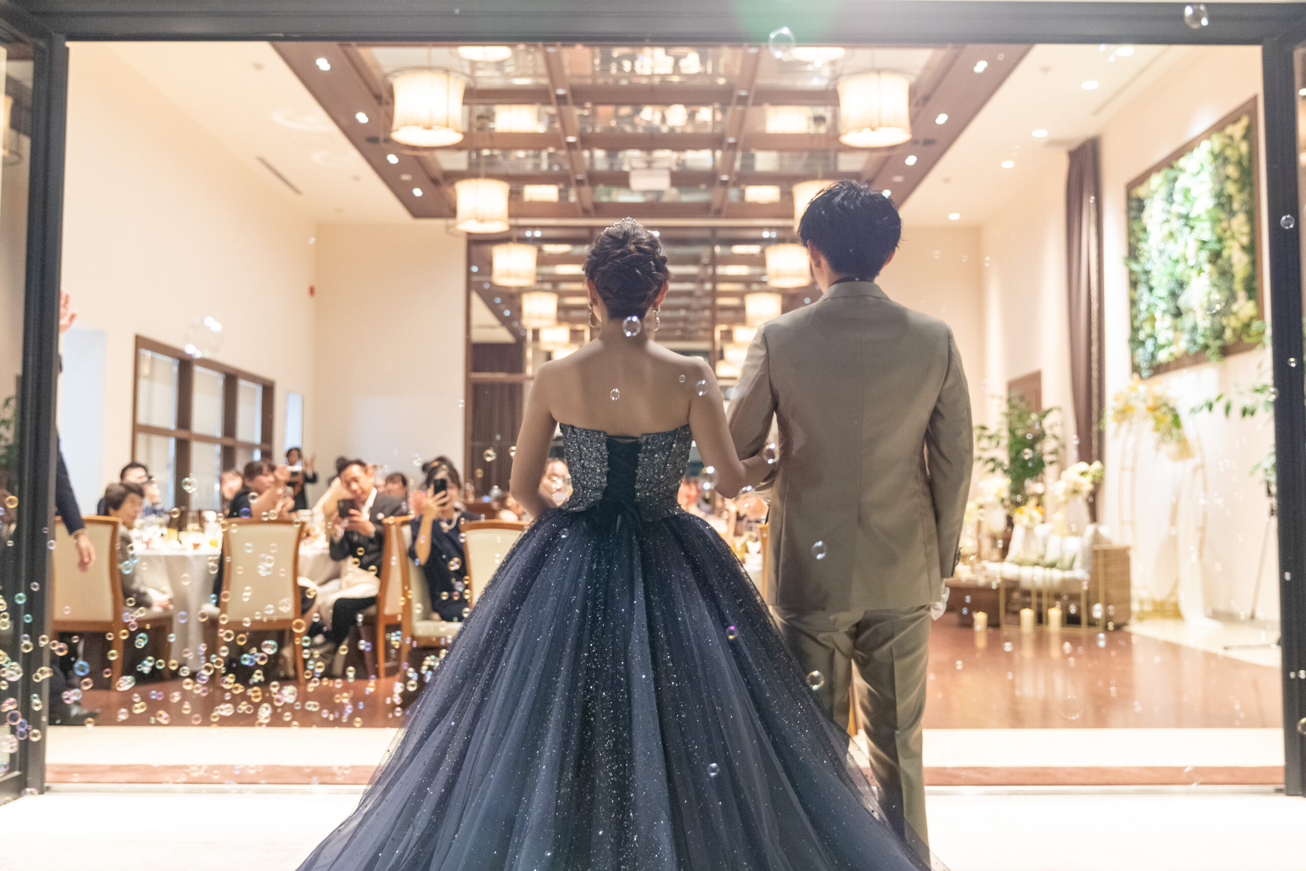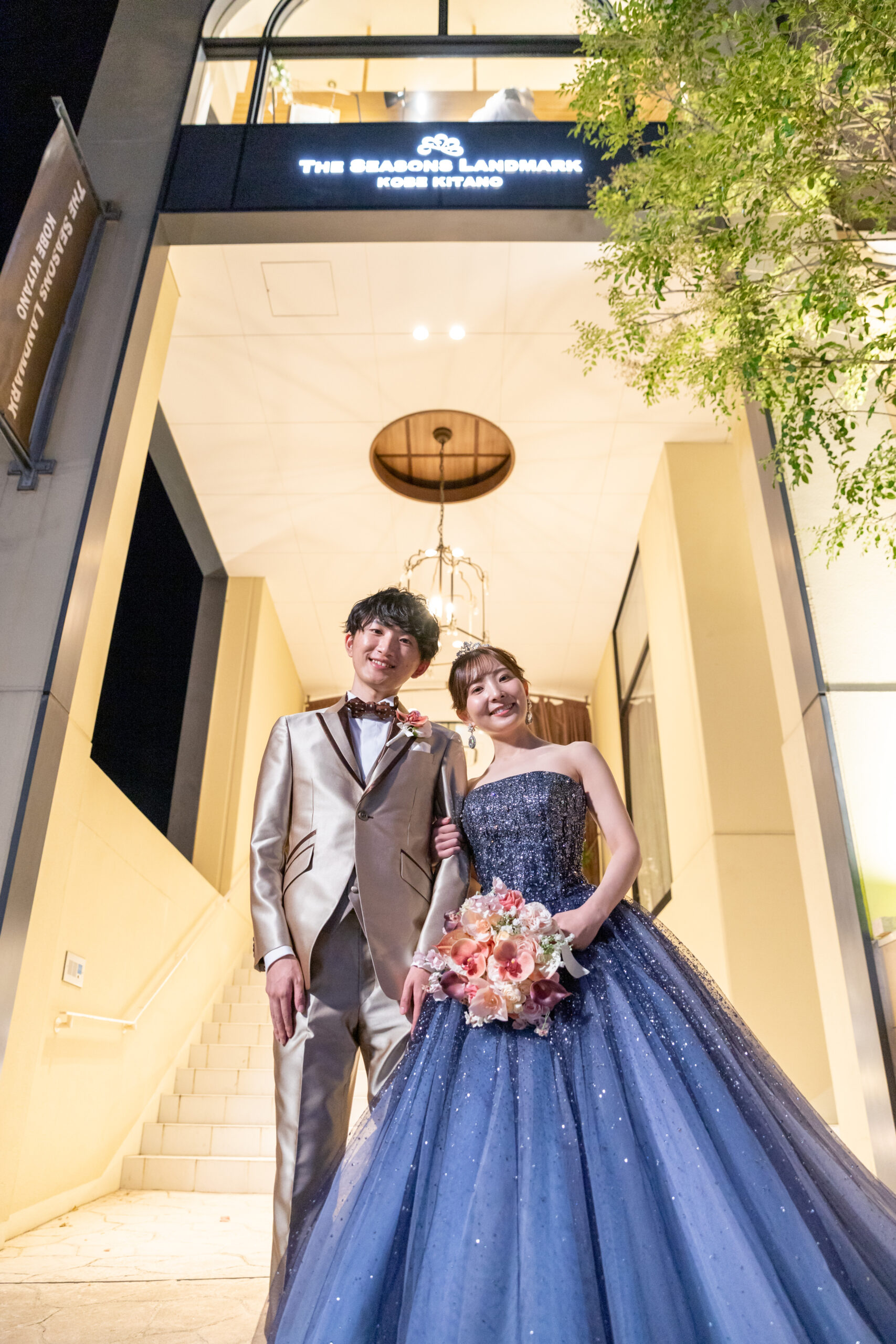 お色直しではナイトウェディングに映えるネイビーのドレスと