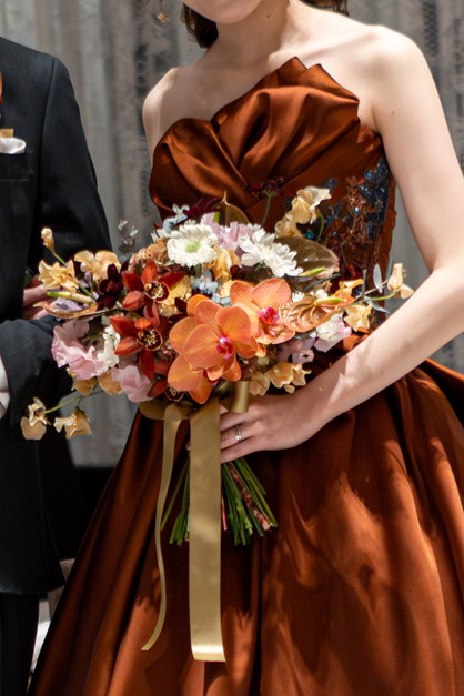 チョコレートコスモスとオンシジウムを使ったコーディネート