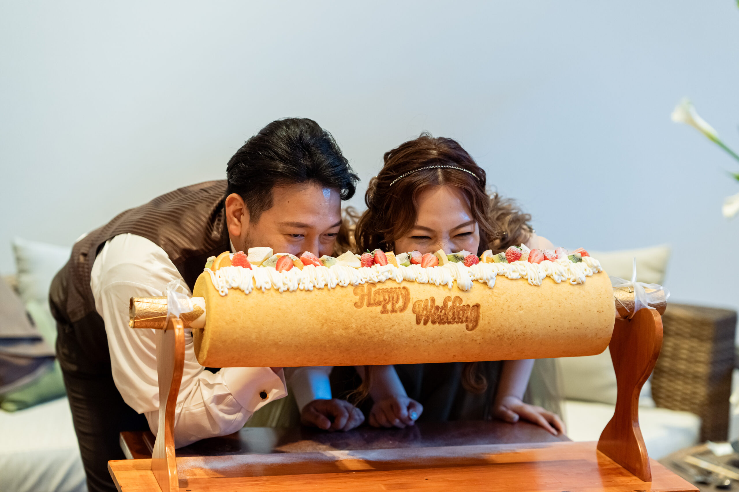 ファーストバイトは、新婦様こだわりの巨大バウムクーヘンにおふたりでガブッとひとくち!